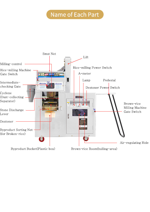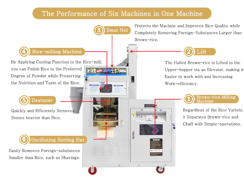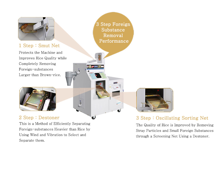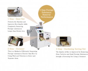 (It) Perfectly polishes brown rice, white rice, and removes stones and foreign-substances(matters) in one go.