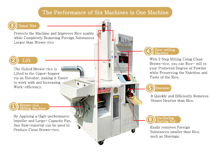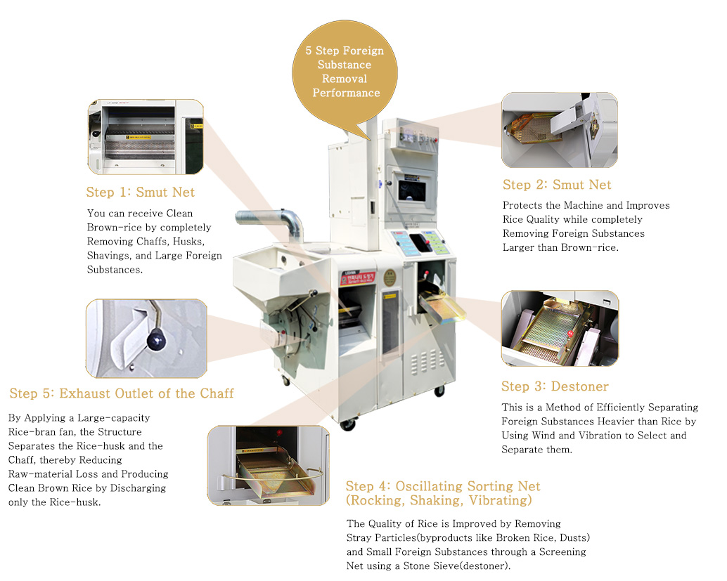 (It) Perfectly polishes brown rice, white rice, and removes stones and foreign-substances(matters) in one go.
